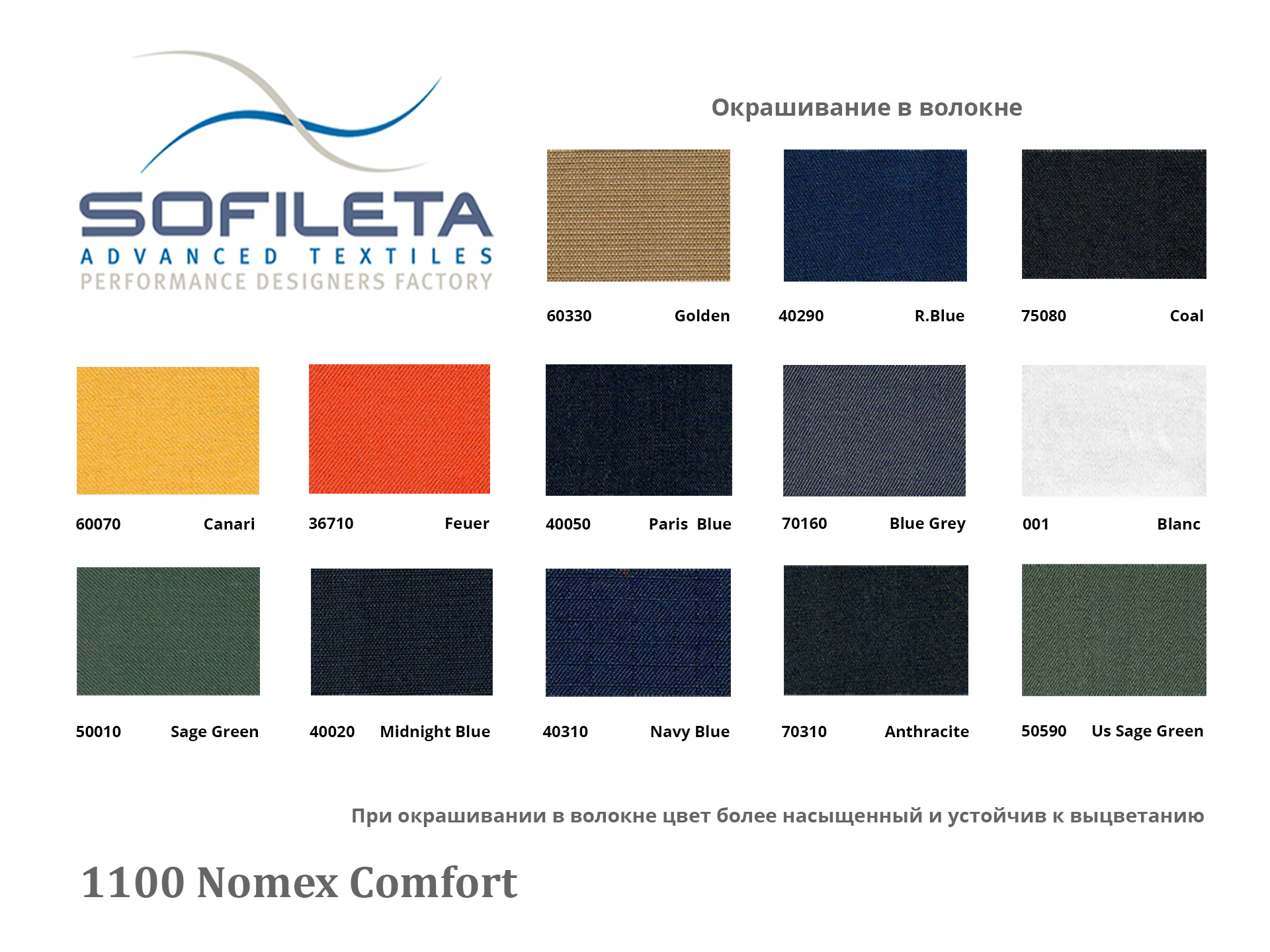 Термостойкая арамидная ткань 1100 Nomex Comfort саржевого переплетения плотностью 220 г/м² от французского производителя SOFILETA Advanced Textiles, лидера рынка материалов для защиты от огня и высоких температур. Завод SOFILETA является партнером компании DuPont по программе качества Nomex®.